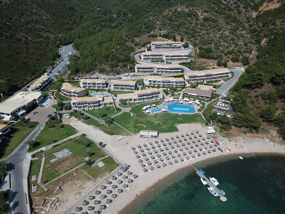 "THASSOS GRAND RESORT" is a seaside hotel, in the Southeastern part of Thassos, at Agios Ioannis-Loukas, designed to meet 5 * requirements. It has 348 beds spread over 162 rooms, suites and independent villas. Amphitheatrically distributed in the natural terrain overlooking the sea. The stadium of about 42 acres, is of particular interest in terms of natural environment but also difficulties in planning because it is crossed by three streams, faces the beach, has a steep slope and is located within the archaeological site of D.D. Θεολόγου. The nearest settlement is at a distance of 7 km.